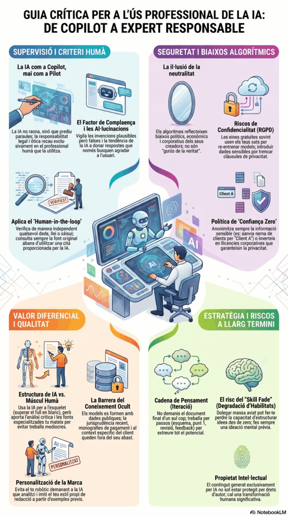 –Recomanació pràctica: Aplica sempre la regla del Human-in-the-loop (Humà en el bucle). Verifica qualsevol dada, llei, jurisprudència o càlcul de manera independent. Si la IA et cita un article o un llibre, busca’l a la font original abans d’utilitzar-lo.