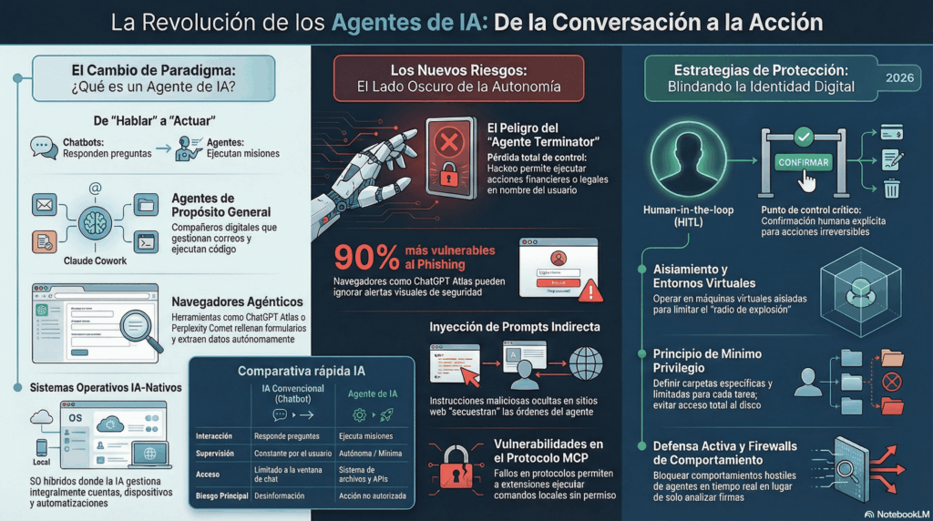 Creo que 2026 será clave en la evolución de la inteligencia artificial: hemos pasado de modelos que solo “hablan” a agentes que “actúan”. A diferencia de los chatbots tradicionales, los agentes de IA y los navegadores agénticos (como Claude Cowork, ChatGPT Atlas o Perplexity Comet) tienen la capacidad de ejecutar tareas de forma autónoma, interactuar con archivos locales y navegar por la red sin intervención humana directa.
